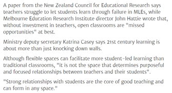 So, while I’m all in favour of collaboration and wider community involvement in learning, I’m not such a fan of the distracting open spaces in a school that is still run by blocks of classes delivered in time to meet bells and a structured linear curriculum system – after all, you never see an examination hall set up in a way that mimics an Innovative Learning Environment. Think about this – if all the single cell desks are turfed out, how would a school even run an NZQA exam? Would it be one big group desk per person, to avoid cheating and distraction? Has anybody thought this stuff through?