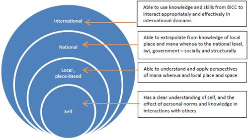 In order for teachers to become biculturally competent and confident (BiCC in the diagram below) we need to think of ourselves and wider society and how our commitment to the bicultural aims of the Treaty of Waitangi are represented in NZ education. It starts with the self at the centre of the equation then radiates out to the local community (classroom), nationally and internationally.