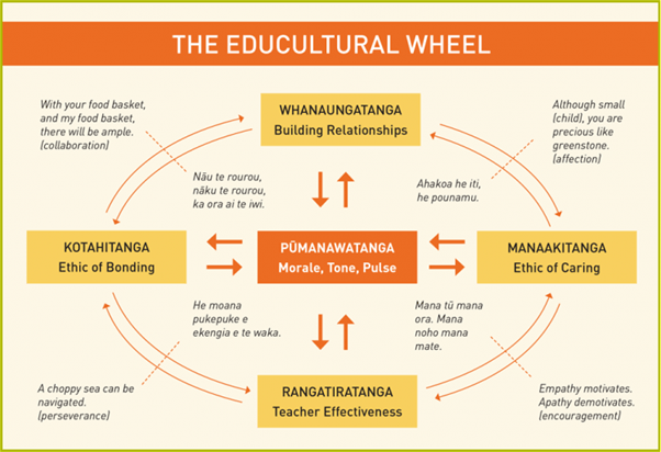 Recognising biculturalism in education requires some planning around how to make sure Maori principles are included in our classrooms, without being seen to be tokenistic, but as a genuine response to the Treaty of Waitangi. The Educultural Wheel below, shows some broad ways that kaupapa Maori can be included in education, and how each of these strands are connected to create a connected whole: